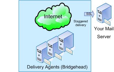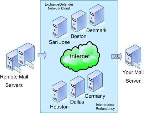 ExchangeDefender operates as a distributed cloud service, with decentralized administration, policy enforcement and archive with business continuity. What that means is that our network, spanning 2400 servers and 14 data centers with over 100 Gbit of Internet bandwidth has no single point of failure and can adapt to network outages, distributed denials of attack, mail floods and more. Based on standards, ExchangeDefender internally implements the ETRN protocol to spool mail for your server in case of network or server outage you may experience. The service is automatically enabled when ExchangeDefender cannot reach your server, for any reason. ExchangeDefender bridgeheads attempt to contact your network every minute for the first 15 minutes of outage, after which the interval is increased to 15 minutes for up to seven (7) days.